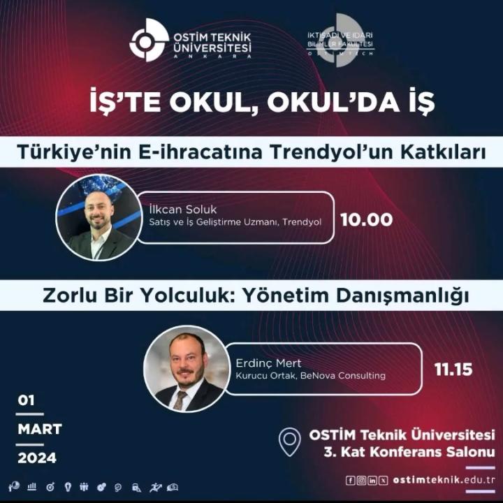 Fakültemiz İş Yeri Eğitimi dersi kapsamında gerçekleştirilen “İş’te Okul, Okul’da İş” Seminerleri üçüncü hafta Türkçe ilk oturumu; Trendyol Satış ve İş Geliştirme Uzmanı Sayın İlkcan Soluk’un katılımı ile, ikinci oturum; BeNova Consulting Kurucu Ortağı Sayın Ersin Mert’in katılımı ile gerçekleştirilecektir.