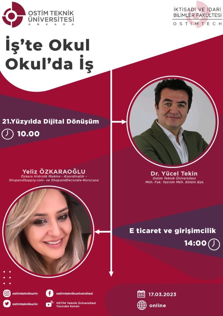 Fakültemiz İş Yeri Eğitimi dersi kapsamında gerçekleştirilen “İş’te Okul, Okul’da İş” Seminerleri ikinci hafta Türkçe ilk oturumu; Dr. Yücel Tekin'in konuşmacı olarak katılımıyla, ikinci oturum ise Yeliz Özkaraoğlu'nun konuşmacı olarak katılımıyla gerçekleştirilecektir.