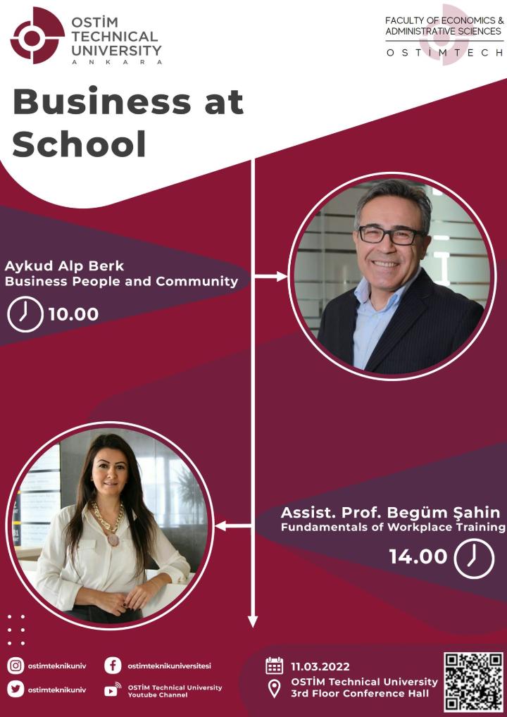 Fakültemiz İş Yeri Eğitimi dersi kapsamında gerçekleştirilen “İş’te Okul, Okul’da İş” Seminerleri İngilizce ilk oturumu; Sayın Aykud Alp Berk’in katılımı ile, ikinci oturum; Sayın Dr. Begüm Şahin’in katılımı ile gerçekleştirilecek.