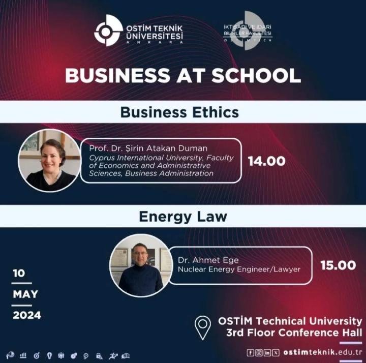 Fakültemiz İş Yeri Eğitimi dersi kapsamında düzenlenen “İş’te Okul, Okul’da İş” Seminerleri on ikinci hafta İngilizce ilk oturum; Sayın Prof. Dr. Şirin Atakan Duman’ın katılımı ile, ikinci oturum ise Sayın Dr. Ahmet Ege’nin katılımı ile gerçekleştirilecektir.