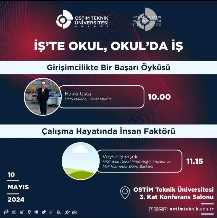 Fakültemiz İş Yeri Eğitimi dersi kapsamında gerçekleştirilen “İş’te Okul, Okul’da İş” Seminerleri on ikinci hafta Türkçe ilk oturumu; Sayın Hakkı Usta’nın katılımı ile, ikinci oturum; Sayın Veysel Şimşek’in katılımı ile gerçekleştirilecek.
