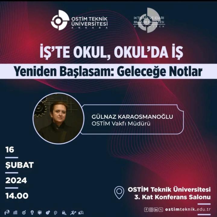 Fakültemiz İş Yeri Eğitimi dersi kapsamında gerçekleştirilen “İş’te Okul, Okul’da İş” Seminerleri Türkçe ikinci oturumu; OSTİM Vakfı Müdürü Sayın Gülnaz Karaosmanoğlu’nun katılımı ile gerçekleştirilecektir.