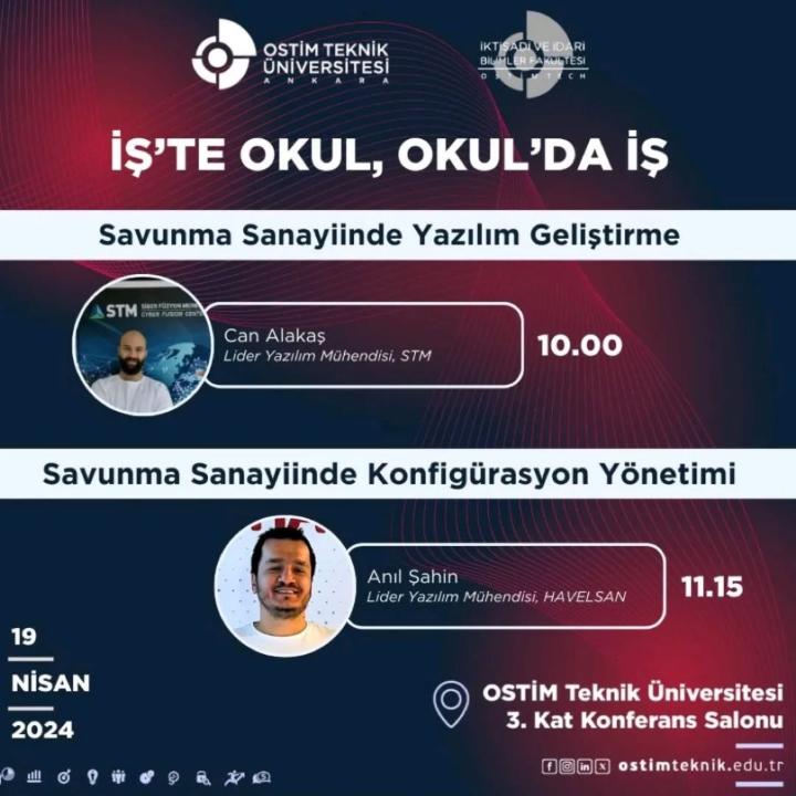 Fakültemiz İş Yeri Eğitimi dersi kapsamında gerçekleştirilen “İş’te Okul, Okul’da İş” Seminerleri dokuzuncu hafta Türkçe ilk oturumu; Sayın Can Alakaş’ın katılımı ile, ikinci oturum; Sayın Anıl Şahin’in katılımı ile gerçekleştirilecek.