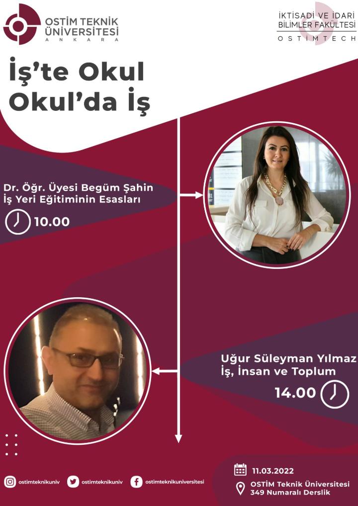 Fakültemiz İş Yeri Eğitimi dersi kapsamında gerçekleştirilen “İş’te Okul, Okul’da İş” Seminerleri Türkçe ilk oturumu; Sayın Dr. Begüm Şahin’in katılımı ile, ikinci oturum; Sayın Uğur Süleyman Yılmaz’ın katılımı ile gerçekleştirilecektir.