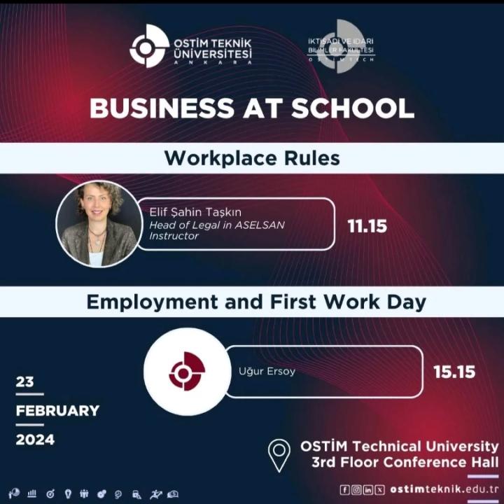 Fakültemiz İş Yeri Eğitimi dersi kapsamında gerçekleştirilen “İş’te Okul, Okul’da İş Seminerleri” İngilizce ilk oturum; Sayın Avukat Elif Şahin Taşkın’ın katılımı ile, ikinci oturum ise Finans Uzmanı Sayın Uğur Ersoy’un katılımı ile gerçekleştirilecektir.