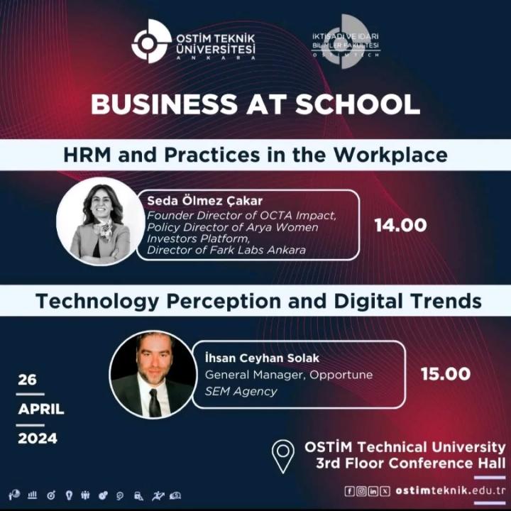 Fakültemiz İş Yeri Eğitimi dersi kapsamında düzenlenen “İş’te Okul, Okul’da İş” Seminerleri onuncu hafta İngilizce ilk oturum; Sayın Seda Ölmez Çakar’ın katılımı ile, ikinci oturum ise Sayın İhsan Ceyhan Solak’ın katılımı ile gerçekleştirilecektir.