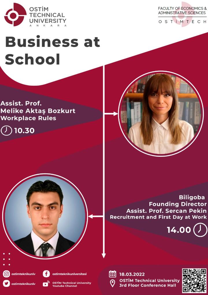 Fakültemiz İş Yeri Eğitimi dersi kapsamında gerçekleştirilen “İş’te Okul, Okul’da İş Seminerleri” İngilizce ilk oturumu; Dr. Melike Aktaş Bozkurt’un katılımı ile, ikinci oturum; Dr. Sercan Pekin’in katılımı ile gerçekleştirilecektir.