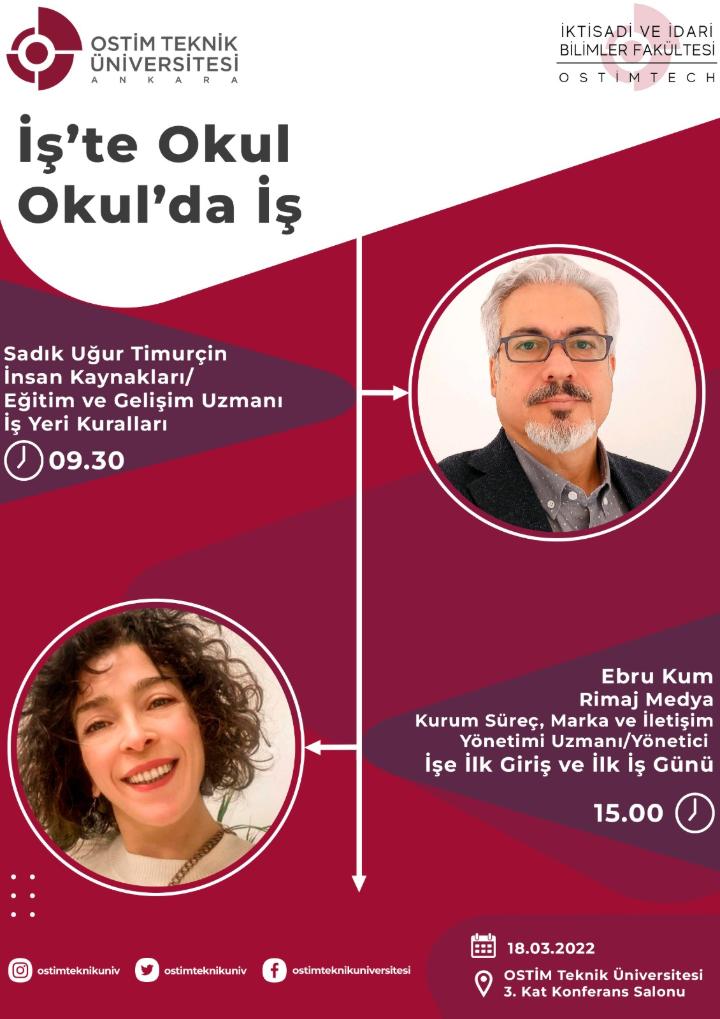 Fakültemiz İş Yeri Eğitimi dersi kapsamında gerçekleştirilen “İş’te Okul, Okul’da İş Seminerleri” Türkçe ilk oturumu; Sayın Sadık Uğur Timurçin’in katılımı ile, ikinci oturum; Sayın Ebru Kum’un katılımı ile gerçekleştirilecek.