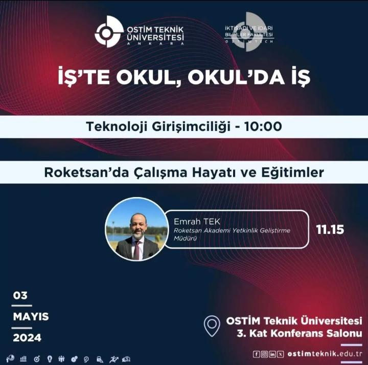 Fakültemiz İş Yeri Eğitimi dersi kapsamında gerçekleştirilen “İş’te Okul, Okul’da İş” Seminerleri on birinci hafta Türkçe ilk oturumu; Teknoloji Girişimciliği konu başlığı ile, ikinci oturum; Sayın Emrah Tek’in katılımı ile gerçekleştirilecek.