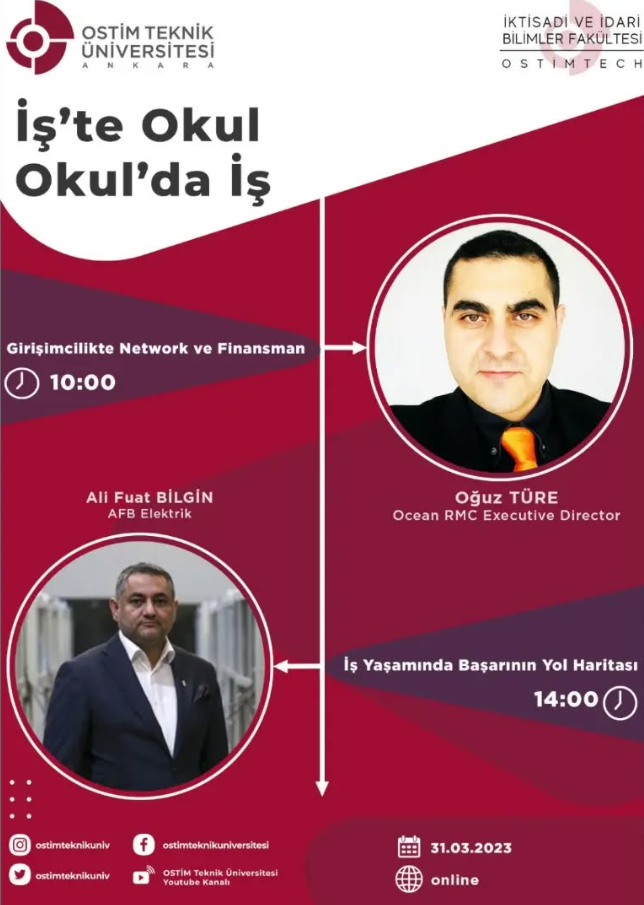 Fakültemiz İş Yeri Eğitimi Seminerleri kapsamında düzenlenen dördüncü hafta Türkçe ilk oturum Oğuz Türe'nin konuşmacı olarak katılımıyla, ikinci oturum ise Ali Fuat Bilgin'in konuşmacı olarak katılımıyla gerçekleştirildi
